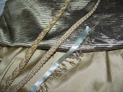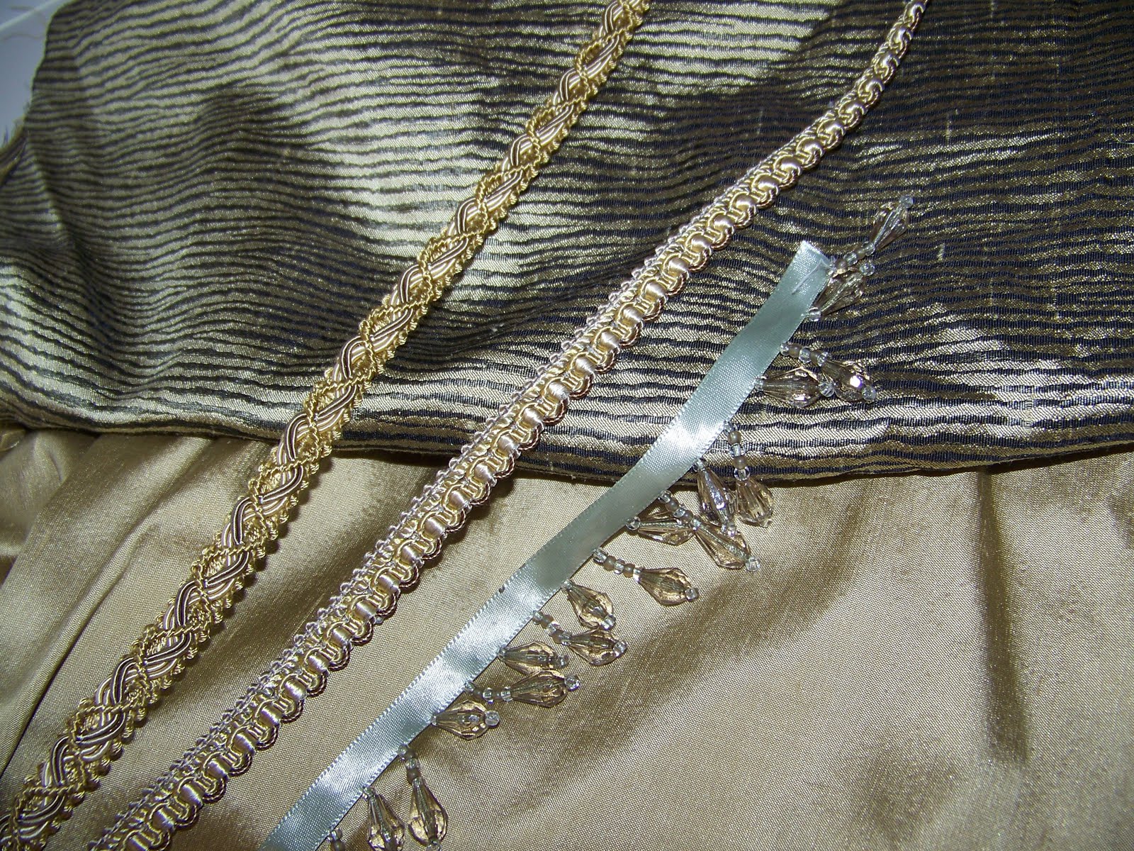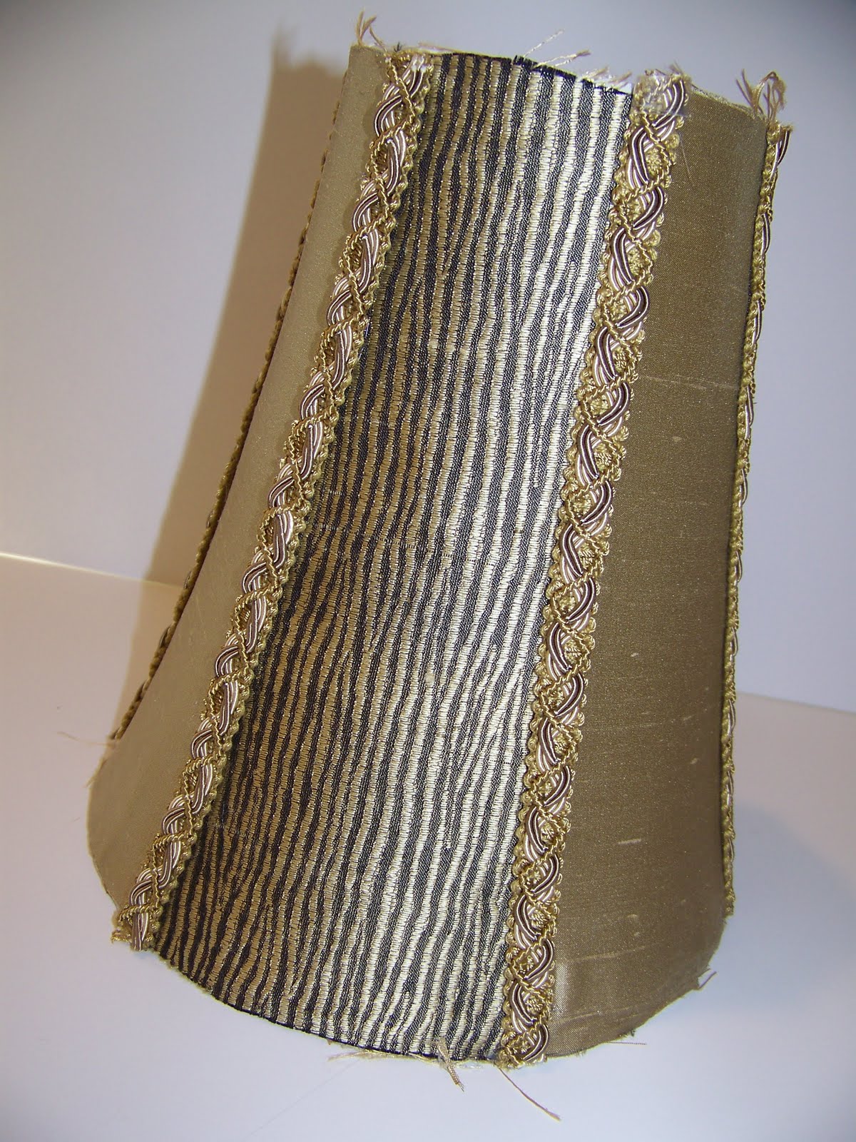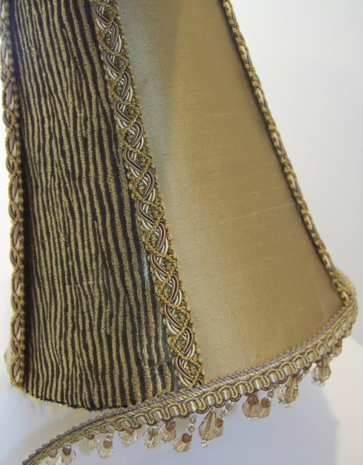 Now it’s time to started transforming this lampshade. First step is to gather your materials. I always use a few different fabrics and trims. I decided to cover this lampshade in a solid gold silk with a coordinating print fabric. The fabric was a gold silk fabric that had a black stripe.It almost looks like a thin zebra print. Next, I selected a beaded trim, and two different braid trims.
