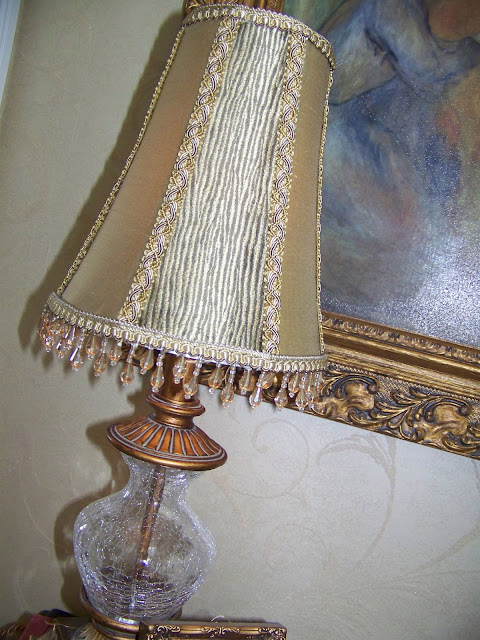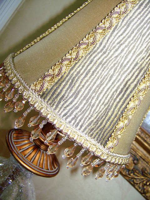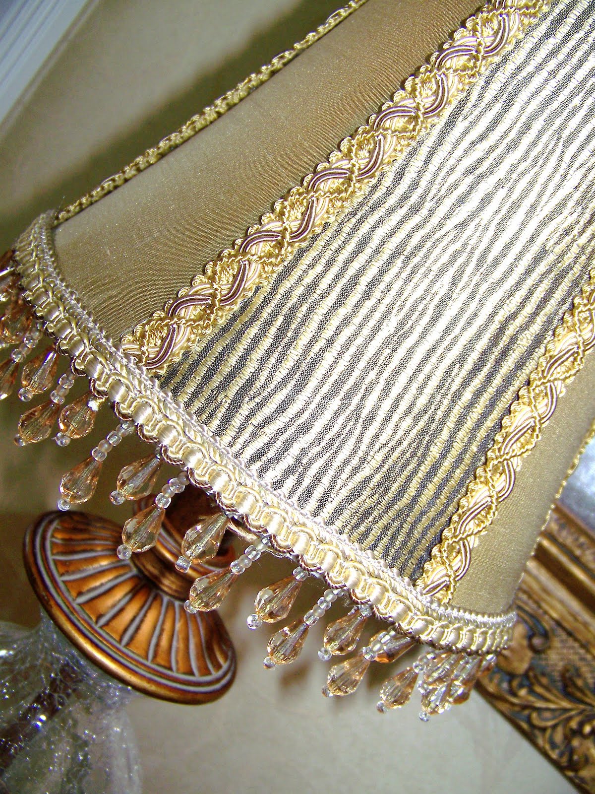 When using beaded trim, the ribbon edge needs to be covered to give it a professional look. I used the same braid trim as I did on the top of the lampshade. Just glue the braid directly on top of the ribbon on the beaded trim. Didn’t I tell you that the trim really added a lot!