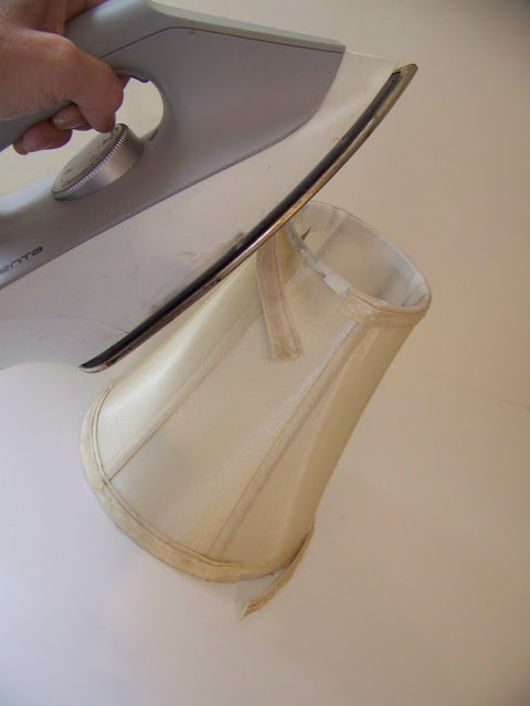 Let’s get to work… The first step is to remove the bias trim from the lampshade. Here’s a trick. Use the steam from your iron to heat up the glue that holds the bias tape to the lampshade. This makes the bias tape very easy to pull off and you won’t rip the shade.