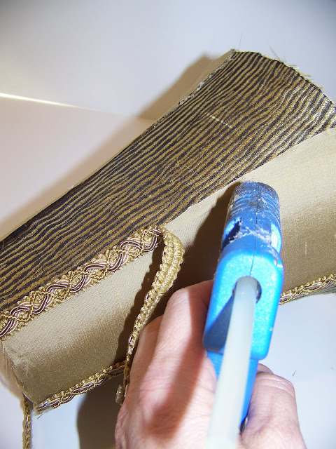 Let’s start putting the trim on. You won’t believe how much this changes the look. Run a bead of glue where the two different fabrics meet each other.