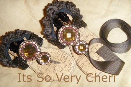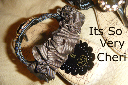 Then I started gathering the ribbon , tucked the end and stitched it down. Then I stretched the elastic out and stitched the ribbon to the elastic. At the end I folded the ribbon under and stiched it down. Aren’t they darling. I think Carrie Bradshaw would approve. I know Miss G4 loves them. Her 3 year old little self thinks she is so grown up and the strap helps keep them on her feet.