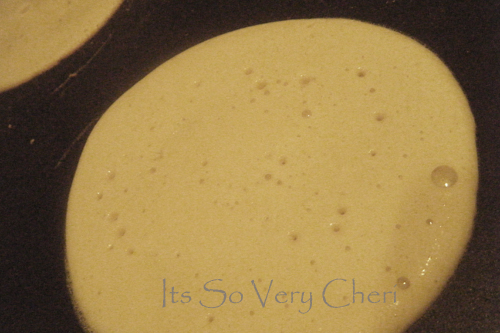 Beat the eggs until frothy. Add in the sugar, flour and extract. Beat until thick. Turn on your gridle to nedium heat, once it is heated thoroughly spoon 3 blobs onto the griddle. Spread each one out with a spoon until they are about 3 ” in diameter. Cook until they are dry enough to flip with a spatula. Cook about 1/2 minute.