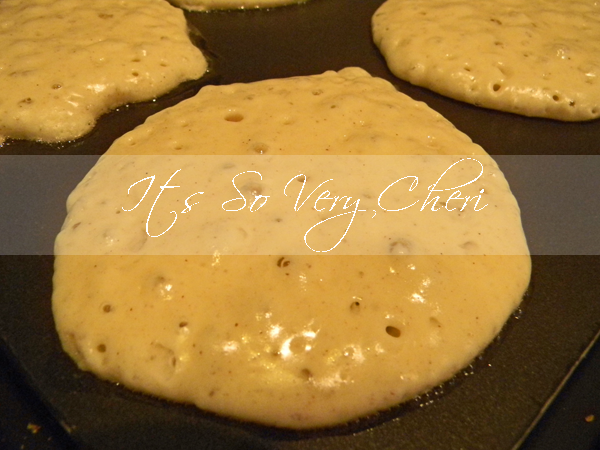 Mix all of your ingredients together till well blended. Heat up a griddle. (I like a griddle because you don’t have to use any oil to cook the pancakes.)