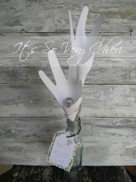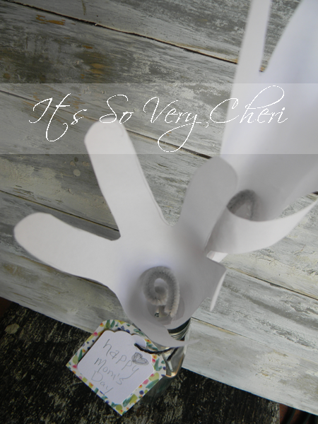 I grabbed a gray pipe cleaners (a yellow would be cute too) and made flowers from the kids hands for “HAND”made Mother’s Day Lilies (flowers) for their Nanny.