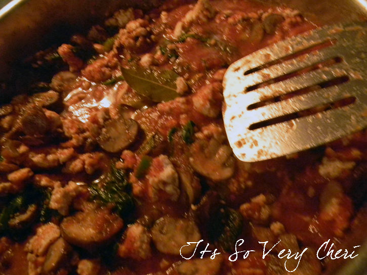 - Cook the meat and mushrooms. Add tomatoes, spinach, garlic, salt and pepper,Italian seasoning and bay leaves. Simmer for 2 minutes, stirring constantly. Remove from heat.