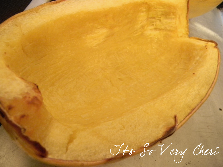 Preheat oven to 350. Cut spaghetti squash in half, clean the seeds out. Use some vegetable spray or a tiny bit of oil olive on the spaghetti squash, then place on a cookie sheet and roast in the oven for 1 hour. Once done, pull it out and just scrape it with a fork.
