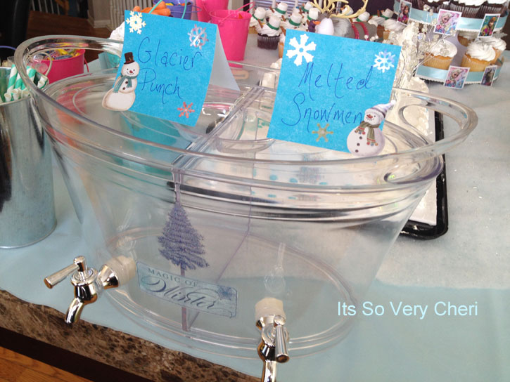 #8 a dual drink dispenser- one side filled with MELTED SNOWMEN–ice water (we will provide Mio drops if anyone wants their water flavored. The other side will be GLACIER PUNCH-Blue Raspberry Punch.