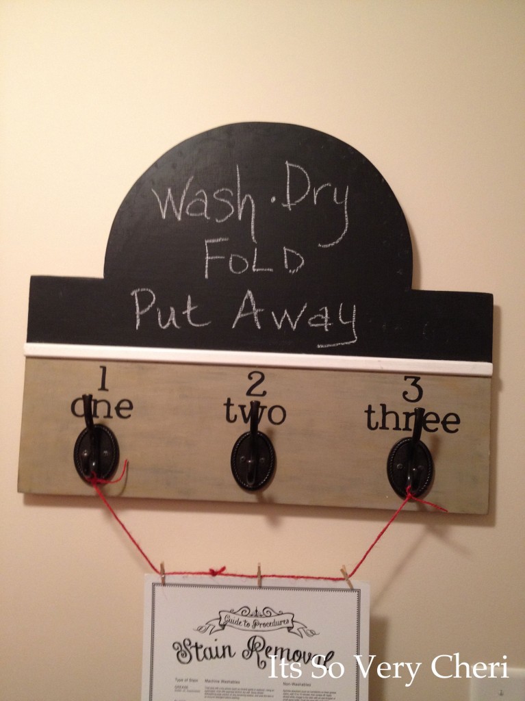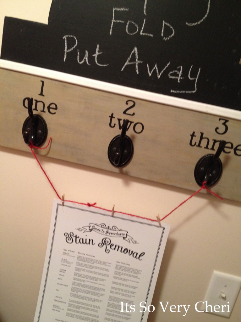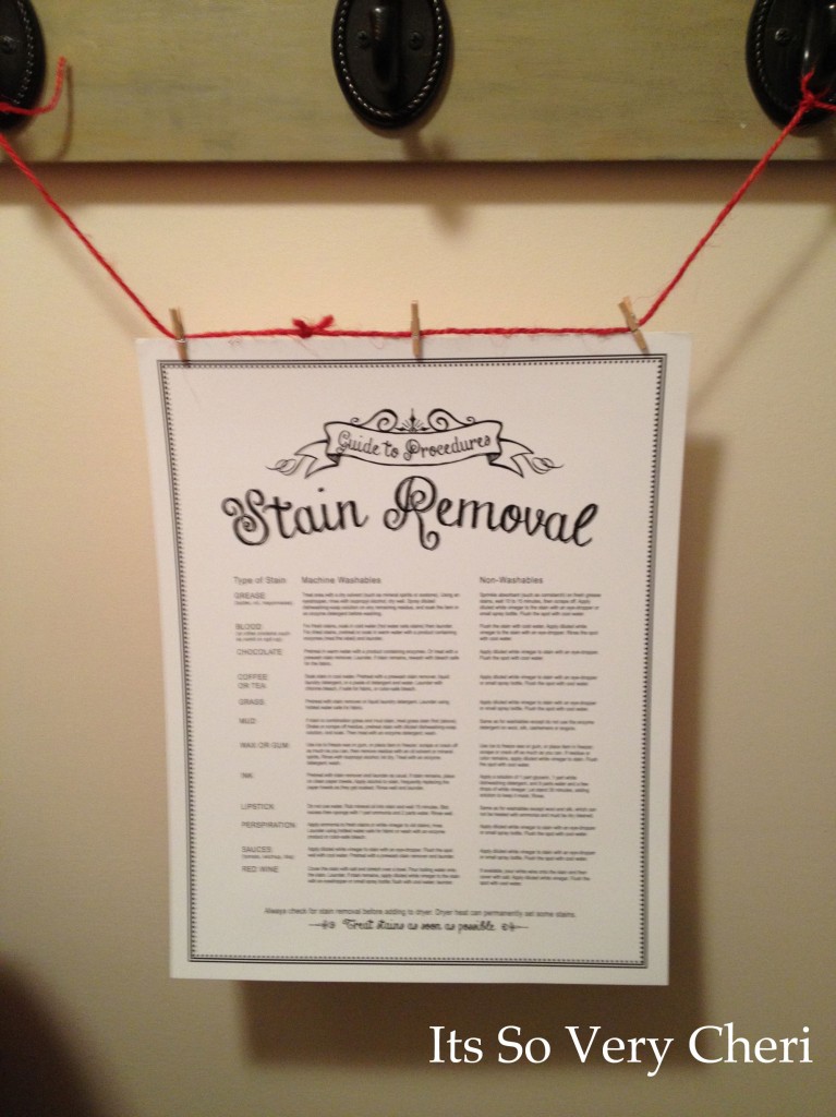 I hung the wood sign that I made and used red twine to hang our STAIN REMOVAL GUIDE from.